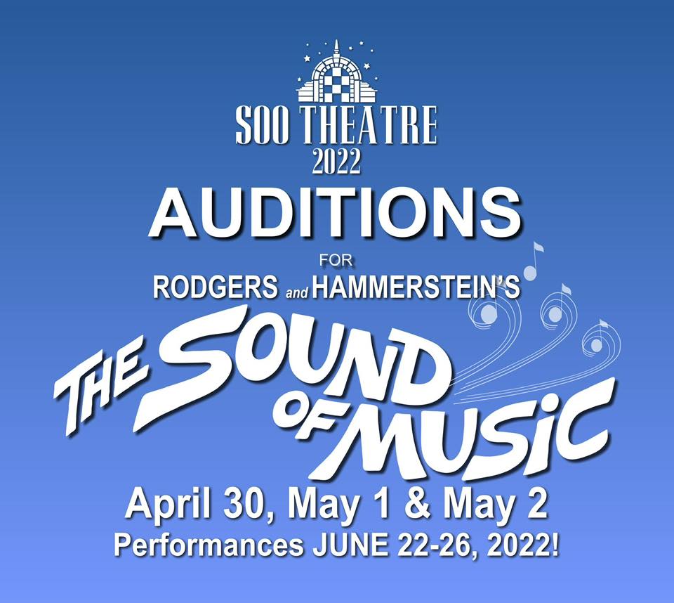 SOUND OF MUSIC auditions will be held in person at the Soo Theatre (or online for college students not back in town yet!) from April 30-May 3, 2022.